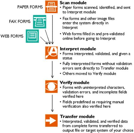 In theScan module, filled-in paper forms are entered into the system using a scanner. Fax forms (or other image files) and filled-in web forms enter the system when theInterpret moduleis started. In the Interpret module, FORMS 5 interprets, validates, and stores the forms in the computer. Uninterpretable characters and responses that break preset validation rules are displayed on the screen in theVerify modulefor quick correction. When the forms are complete, theTransfer modulemoves the captured and verified data to the output file or target system of your choice. The optionalMonitor moduleprovides enhanced system supervision by offering reports of system activity, as well as real-time monitoring of the FORMS 5 system and its users. FORMS 5's scalability allows you to process current volumes and then simply add modules to the system as your forms processing needs increase. You can also integrate Eyes & Hands FORMS 5 with other computer systems, such as electronic archiving and workflow systems. FORMS 5 is incredibly open and flexible, offering you many ways to customize the system to your needs.